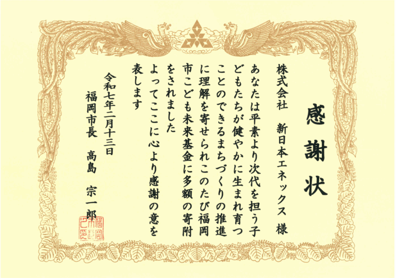 福岡市「こども未来基金」に寄付をしたことで、福岡市長 高島宗一郎様より感謝状を拝受いたしました。