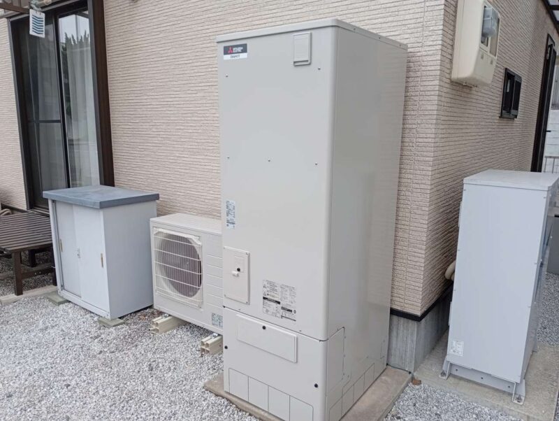 既設の電気温水器とパワコンを撤去し、三菱製エコキュートと新しいパワーコンディショナーを設置しました。